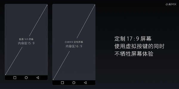 小米MIX还采用了隐藏式虚拟按键设计,但同时屏幕比例定制为17:9,因此内容区的比例仍然保持为16:9,还可以自动隐藏悬浮球,释放屏幕空间。