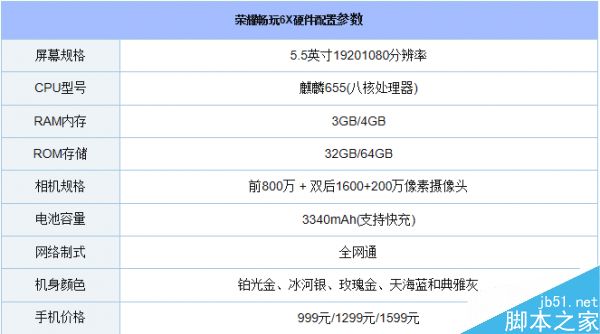 荣耀畅玩6X配置参数,详情如下所示,参数党必看: