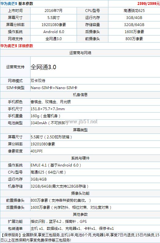 华为麦芒5分为2个版本,其中全网通标配版采用3GB内存和32GB存储空间,售价2399元;而全网通高配版,则采用4GB内存和64GB存 储空间,售 价2599元,其他硬件参数两个版本则完全相同。