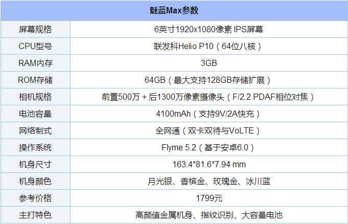 超大屏幕(FHD级)是此次魅蓝max的主要卖点,LTPS技术使得屏幕本身有着更高的通透率,对比度达到1000:1,最高亮度可达450尼特,并在系统内部加入护眼模式。硬件配置方面,魅蓝max采用了联发科Helio P10八核处理器,3GB RAM+64GB eMMC 5.1闪存(支持128GB扩展),联发科平台的能效比一直有着不错的表现,与魅蓝max的4100mAh电池结合,在待机、续航方面的表现可以值得期待,并且魅蓝最高水准的24W快充也成为了魅蓝max的标配,最快30分钟便可冲入45%的电量。