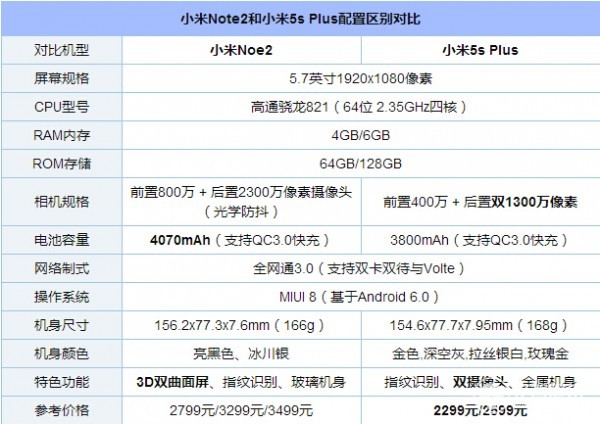 首先来看看小米Note2和5splus的配置区别,如下图所示: