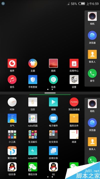 另外,nubia手机上最让笔者愉悦的一个功能就是多任务分屏,miniS也继承了上手跟之前体验保持一致,从屏幕下方向上轻轻滑动即可实现分屏效果,分配出现后会有两个桌面,相互没有影响你可以随意操作,同时应用兼容性非常好,并不局限在个别应用,整体相当流畅没有卡顿感。