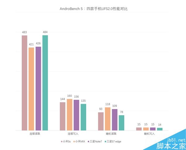 同时,网友i冰宇宙 也送上了小米5S、小米MIX、S7 edge、Note 7的新版跑分情况,同样都是采用三星的UFS 2.0闪存,有何区别?