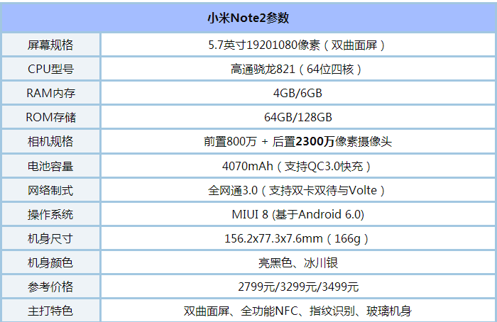 小米Note2最大的亮点在于配备了似曾相识的双曲面屏幕,与三星S7 Edge类似,配备了双曲面屏幕,是继vivo Xplay5之后的,国产第2款双曲面屏智能手机。话不多说,以下是详细参数