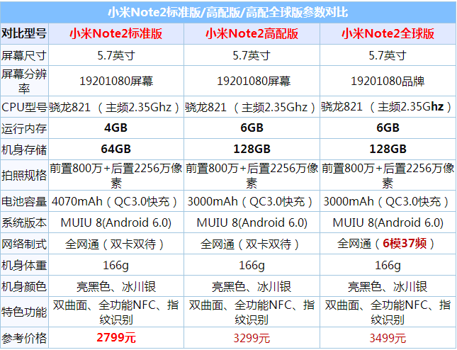 具体版本划分上,小米Note2分为标准版、高配版和高配全网通版本,各版本之间的区别,从下面的参数中可以一眼就看出来。