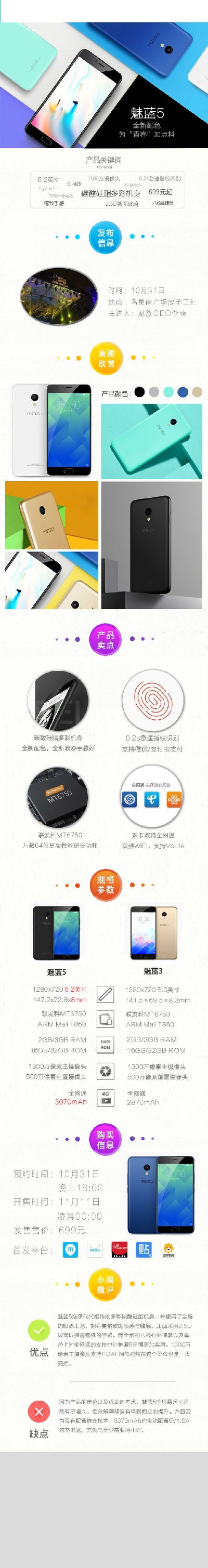 10月31日,魅族在“魅蓝之夜”演唱会上正式发布魅蓝系列的新一代产品魅蓝5,这款手机在外观上延续了魅蓝手机经典的外观设计,仍旧使用碳酸硅脂作为机身材质。与前代不同的是,本次魅族联合供应商采用全新的喷漆工艺,让魅蓝5在多彩的同时手感也得到进一步的提升。作为一款价格为699元的手机,魅蓝5适合众多大学生群体以及初入职场的年轻用户。在详细评测出来之前,小伙伴们就先通过一张图来了解一下这款新品的特点吧。
