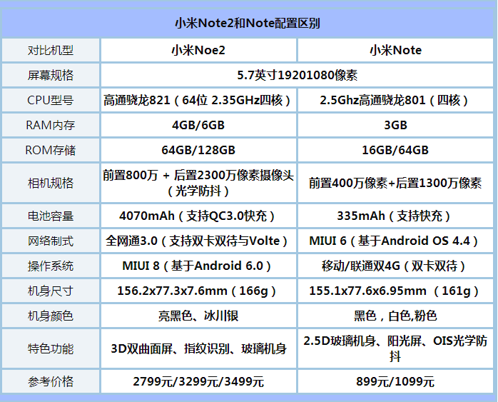最后我们再来看看小米Note2和Note配置区别对比,如下表格所示。