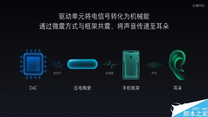 其实早在刚发布时候,我们就曾对此进行介绍。它使用的并不是传说中的骨传导技术,而是悬臂梁压电陶瓷振动然后传导到手机中框的发声方式。也就是把音频数字信号转换成模拟信号,然后引导陶瓷中框共振,最后通过声波传递到耳朵里。