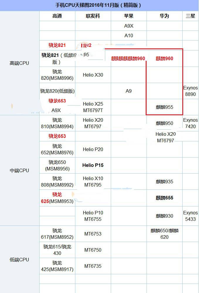 文章最后我们通过手机CPU天梯图具体看看麒麟960和955的位置,如图所示。