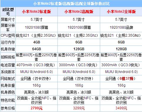 具体版本划分上,小米Note2分为标准版、高配版和高配全网通版本,各版本之间的区别,从下面的参数中可以一眼就看出来。