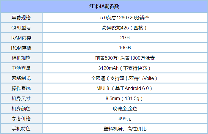 配置方面,该机采用5英寸720p显示屏,搭载骁龙425处理器1.4GHz四核心处理器(Adreno 308 500MHz),内置2GB内存和16GB机身存储空间,提供500+1300万像素摄像头,电池容量3120mAh,支持双卡双待全网通。2.4GHz Wi-Fi/蓝牙4.1,搭载MIUI 8系统。