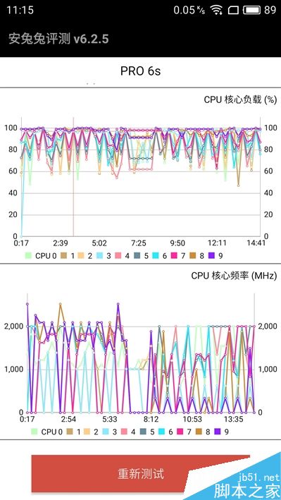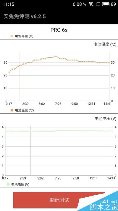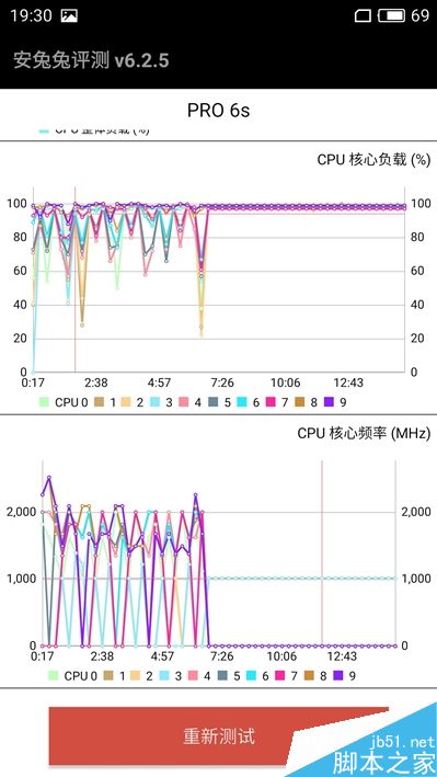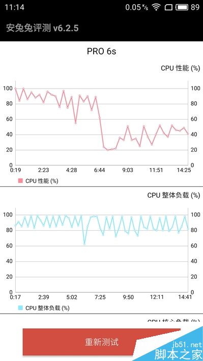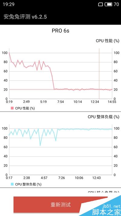 安兔兔拷机测试(100%亮度/最高负载),Helio X25的脆弱性暴露无遗,一开始就降频了,80-100%性能区间坚持了大约6分钟,然后就过热大大降频,性能先是降低到20%,然后回升到40%上下。