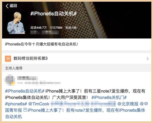 发生问题的用户反应:手机在不同电量情况下(手机电量80%左右同样会出现),均会不定期出现自动关机,并伴有电量快速减少的现象(一分钟掉电百分之一及其以上)。这个问题在百度和微博都搜得到,并且目前排在微博数码类热搜关键词第三位。