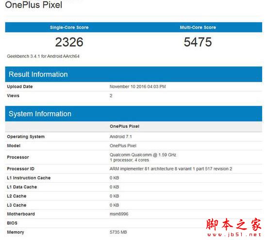 从数据可以看到,onePlus Pixel单核跑分成绩为2160,多核跑分成绩为4713,运行Android 7.1系统,这也是首台运行Android 7.1系统的一加手机。