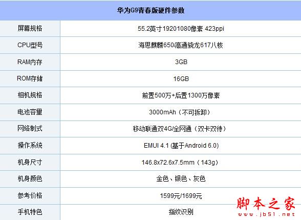 先来看看华为G9青春版硬件配置参数,详情如下所示,参数党必看: