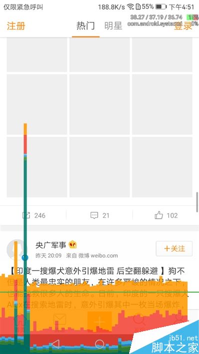 我们选择了手机淘宝和微博两个最考验系统流畅性的应用,并快速滑动,结果柱状曲线也只是略微超过绿线,直观感受方面也相当流畅。