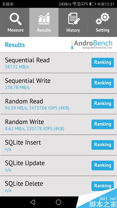 Androbench 5存储测试中,持续读取速度十分惊人,最低的时候也超过560MB/s,最好的时候甚至逼近600MB/s,已经是当今高端PCI-E SSD的水准。