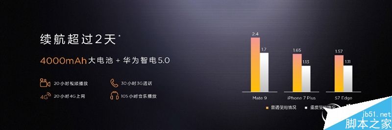 官方称,Mate 9支持连续音乐播放105小时、连续视频播放20小时、连续3G通话30小时、连续4G上网20小时,普通用户可使用2.4天,重度使用也可坚持1.7天。