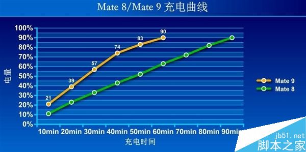 从测试曲线来看,作为对比,10分钟内Mate 8只充进了11%。而到30分钟时,华为Mate 9充电量已经达到57%。60分钟之后,充电量已达到90%,而Mate 8的电量仅为63%。