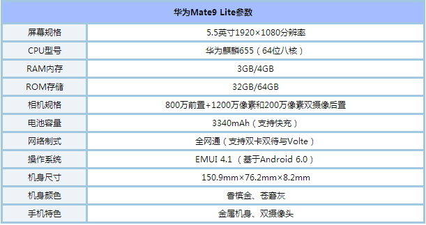 华为Mate9 Lite将配备2.5D5.5英寸1080P屏幕,搭载麒麟655八核处理器,最高频率为2.1GHz,拥有3GB运存+32GB存储以及4GB运存+64GB存储两种版本。机身尺寸为150.9mm×76.2mm×8.2mm。