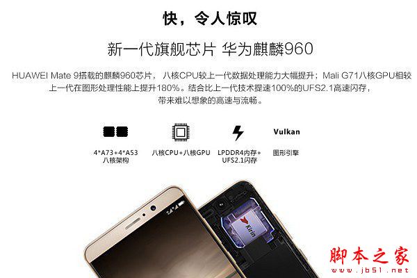 麒麟960采用16nm工艺设计,全球率先商用了最新的A73 CPU,采用4*A73+ 4*A53架构,最高主频2.4GHz,与上一代相比,CPU性能提升18%,能效提升15%。GPU方面,麒麟960同样全球率先商用了Mali G71 MP8,与上一代相比,麒麟960图形处理性能飙升180%。同时,GPU能效提升40%,此外麒麟960还支持超级快充、金融级安全等特性。