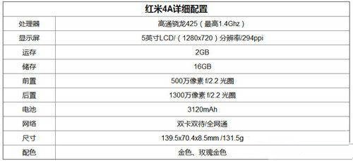 红米4A在5英寸的机身空间里塞进了一块3120mAh的大电池,并且将手机重量控制在130克左右,这不得不给小米点个赞。此外,作为一款入门级手机,红米4A的配置却毫不含糊。该机搭载的是主频为1.2GHz的高通骁龙425四核处理器,辅以2GB内存,16GB内置存储(可扩展128GB),支持双卡双待全网通,预装MIUI 8系统。