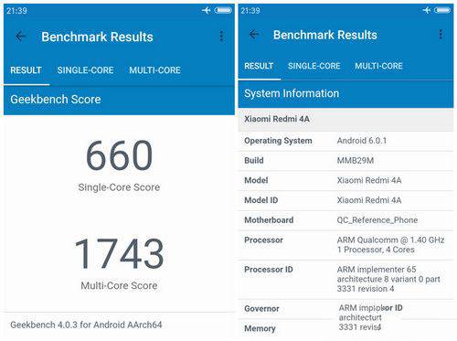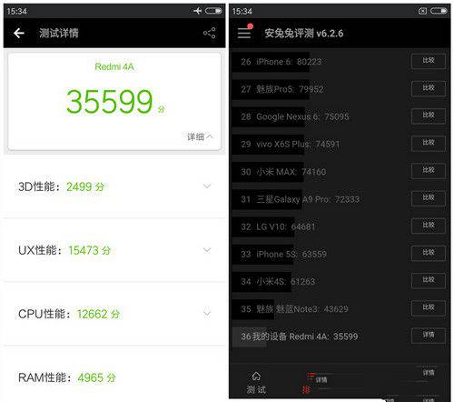 红米4A在安兔兔的跑分为3.5万分,这对于主打老人机以及学生党这些人群的红米4A,其性能足够日常的使用。在GeekBench跑分软件上,红米4A发挥了Adreno GPU的性能优势,单核跑分660分,多核跑分1743,单核性能跟联发科的P10十分接近,但是在多核性能方面,骁龙425由于核心以及频率的问题,跟P10相差甚大。