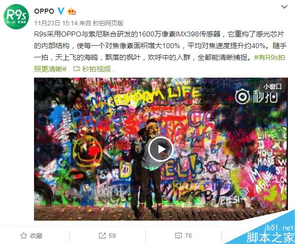 比如OPPO前几天微博发布的秒怕视频,并配文字“R9s采用OPPO与索尼联合研发的1600万像素IMX398传感器,它重构了感光 芯片的内部结构,使每一个对焦像素面积增大100%,平均对焦速度提升约40%。随手一拍,天上飞的海鸥,飘落的枫叶,欢呼中的人 群,全都能清晰捕捉。”