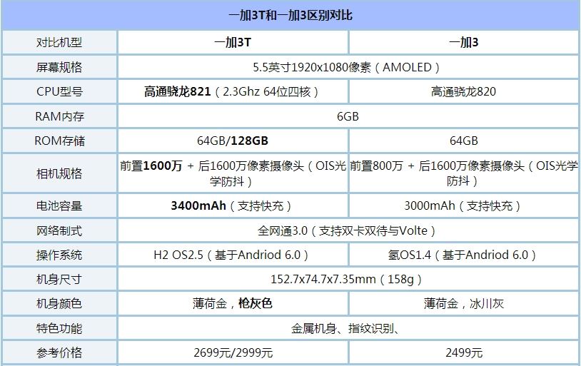 11月29日下午2点,一加科技在北京举办媒体沟通会,正式将此前在海外已经亮相的一加手机3T带到国内用户面前。该机相比前代主要有5点变化和升级,售价2699元,不过还有一个更高128GB内存版本,售价2999元。那么一加3T和一加3有什么区别?一加3T和一加3哪个更值得入手?下面就一起来看看对比区别吧!