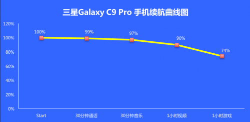 下面看看三星Galaxy C9 Pro、索尼Xperia XZ手机在续航测试综合表现如何,以如下:通话(30分钟)、音乐(30分钟,无损音乐)、游戏(1小时)、视频(1小时,本地1080p视频),这几项来测续航性能,测试在自动亮度、外放音量50%条件下进行。