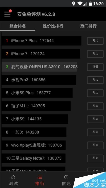 在安兔兔测试中,一加手机3T得到了163208分,这在目前所有的Android手机中都处于最拔尖的水平。