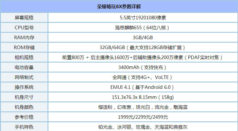 硬件方面,荣耀畅玩6X分为3个版本,主要基于内存与存储空间不同,搭载麒麟655八核64位处理器,3GB/4GB运行内存,32GB/64GB存储空间,后置主1600万像素摄像头,具备出色的性能与拍照体验。