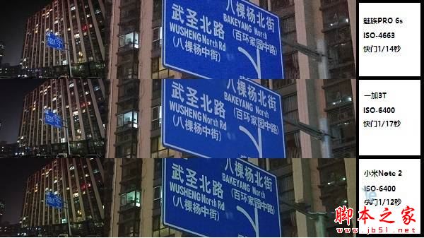 下面,我们放大样张,观察夜拍时三款手机的细节表现。面对高ISO带来的高噪点,魅族PRO 6s铤而走险选择锐化的处理,试图保留更多的细节,但整个画面都被噪点覆盖的情况下,这些细节也是基本上看不见的;小米Note 2出现了过度的涂抹,画面开始有“糊成一片”的情况,严重影响观感;一加3T则是三款手机中观感最好的,在路牌的字样上和建筑物窗户格栅的细节上都展现出不错的还原能力。