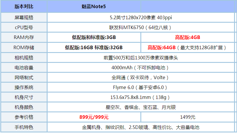 从对比来看,魅蓝Note5标准版和低配版运行3GB内存和16GB/32GB存储空间,售价899元,而魅蓝Note5高配版运行4GB内存和64GB存储空间,售价1499元。除此之外,三版本再无其它任何区别。