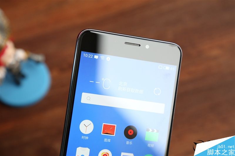 魅蓝Note5的屏幕表面覆盖了一层2.5D玻璃,屏幕边缘与金属中框的衔接过渡自然,摸上去也不会觉得硌手,在阳光的反射下质感十足。光线感应器和距离传感器巧妙隐藏在黑色面板下,不易察觉,前置摄像头位于听筒右侧。