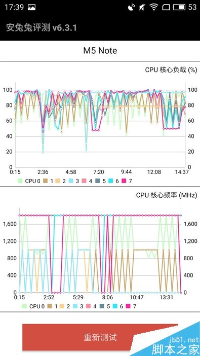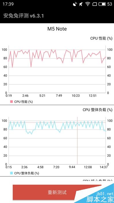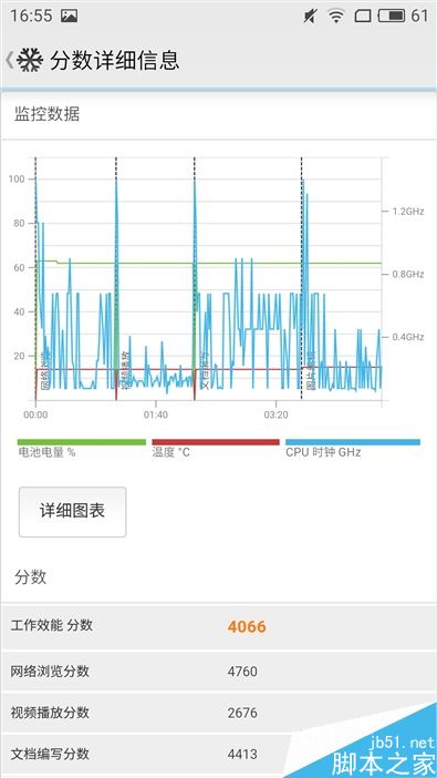或许是工程机的缘故,PCMark的综合效能测试得分只有4066分,右图中CPU的占用率绝大部分时候处于50%以下,完全没有发挥联发科Helio P10应有的性能,需要魅族后期优化一下。