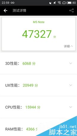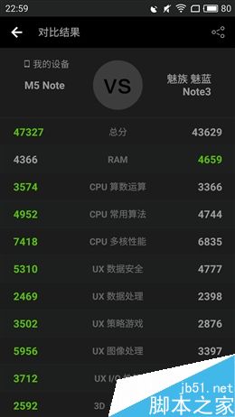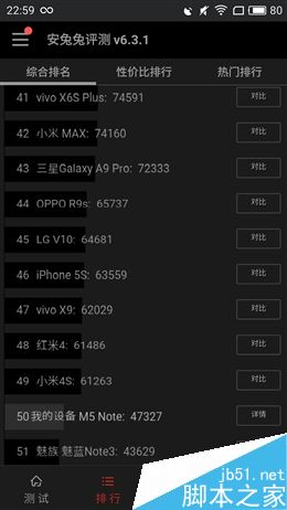 安兔兔跑分测试,魅蓝Note5的成绩是47327分,比同样搭载Helio P10的魅蓝Note3高出了3600多分。经过对比发现,除了RAM部分,魅蓝Note5的各项表现都超过了魅蓝Note3,由此可见魅蓝Note5充分发挥了Helio P10的性能。