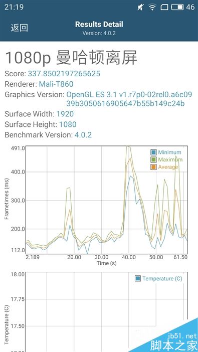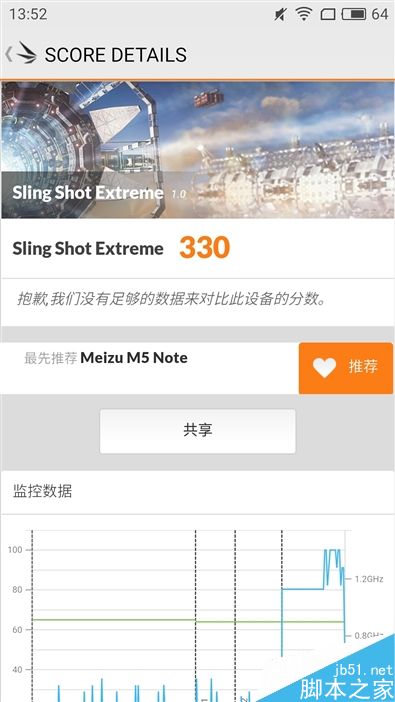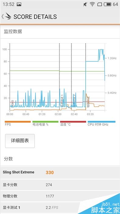 3DMark GPU测试,魅蓝Note5只得了330分,通过右图的监控数据可以看出,其最好的表现还不到30Fps,多数时候在2Fps上下浮动。