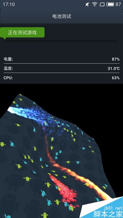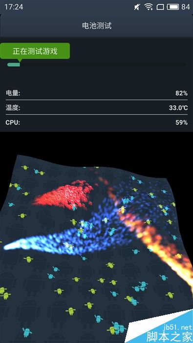安兔兔电池测试部分包括游戏、CPU满负荷运载、网页浏览和多媒体播放四个环节,经过一轮测试后,电量从87%降到84%用时14分钟,预计全程可用8个小时。