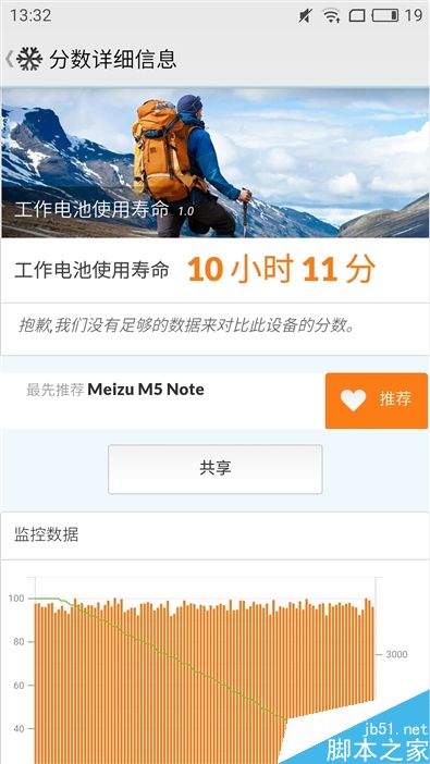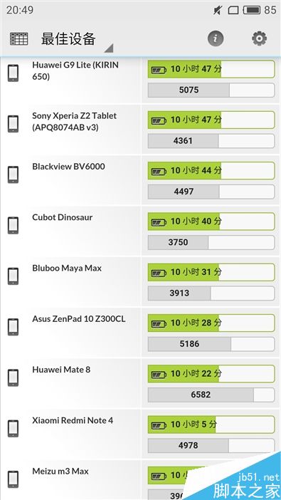 PCMark电池测试成绩达到了10小时11分钟,通过右图的对比排行看出,魅蓝Note5的续航成绩超过了红米Note4(10小时5分钟)和自家的魅蓝Max(10小时4分钟),即使重度用户无需担心电量问题,中度用户轻松用两天。