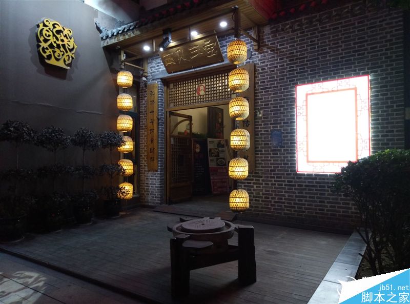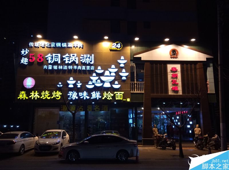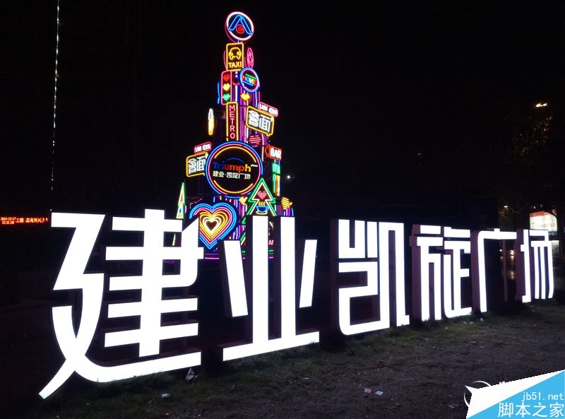 夜景下亮度稍有些不足,选定对焦点后画面会明显暗下来,主体细节都能看得清楚,噪点较少,炫光控制得不错,颜色还原也比较到位,部分场景中光源处(灯箱)出现了过曝情况。