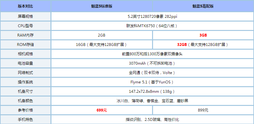 魅蓝5分为标准版和高配版2个版本,其中标准版采用2GB RAM + 16GB ROM方案,而高配版则采用3GB RAM + 32GB ROM存储方案,其它方面双版本完全没有区别。