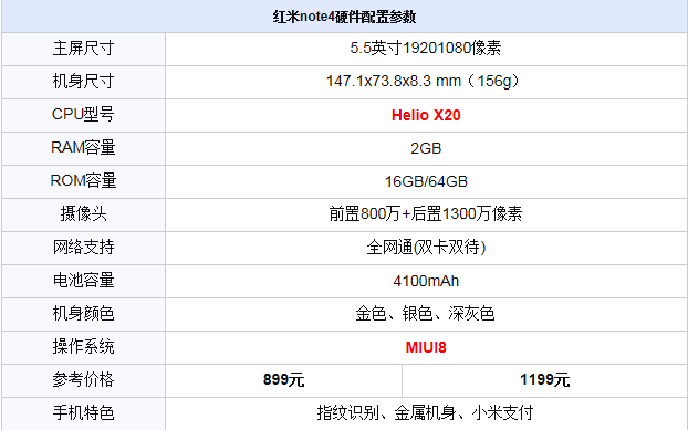红米Note 4采用全金属机身,预计配备5.5寸1080p屏幕、联发科Helio X20十核处理器、2/3GB内存。