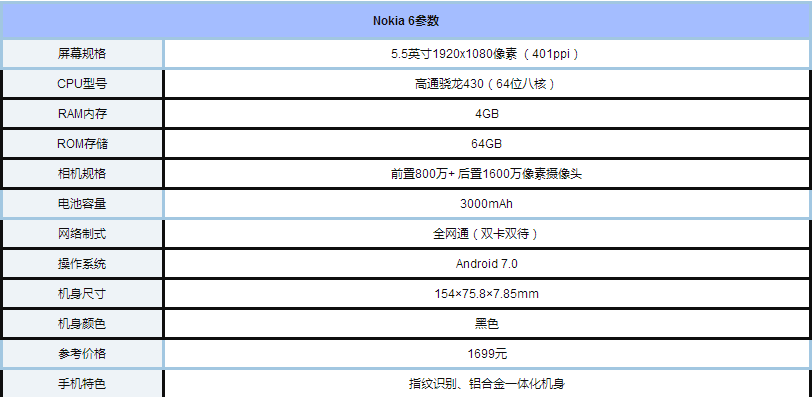 首先看一下诺基亚6的配置参数汇总表,如下所示: