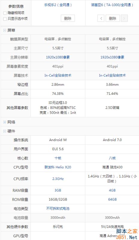 最后我们一起看一下乐视2和诺基亚6配置参数全面区别对比,如下图所示: