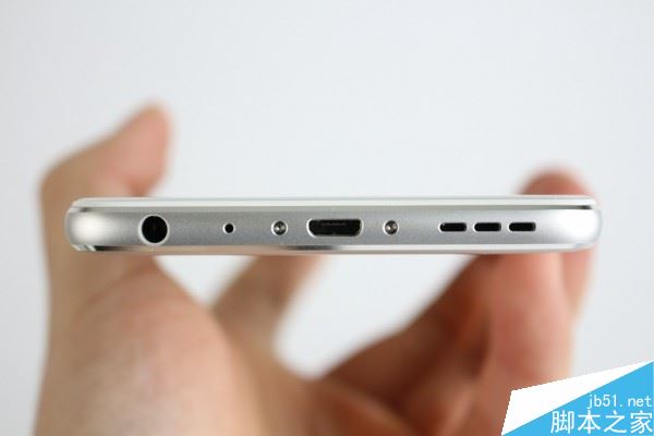 左侧是Sim卡卡槽支持两张Nano卡,并且支持TF卡的扩展,右侧是电源键和音量键,底部的扬声器开口相比之前的魅蓝Note3有明显区别,用了三个椭圆形的开孔;