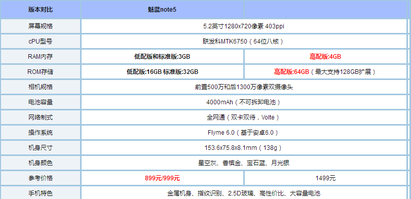 从对比来看,魅蓝note5标准版和低配版运行3GB内存和16GB/32GB存储空间,售价899元,而魅蓝note5高配版运行4GB内存和64GB存储空间,售价1499元。除此之外,三版本再无其它任何区别。
