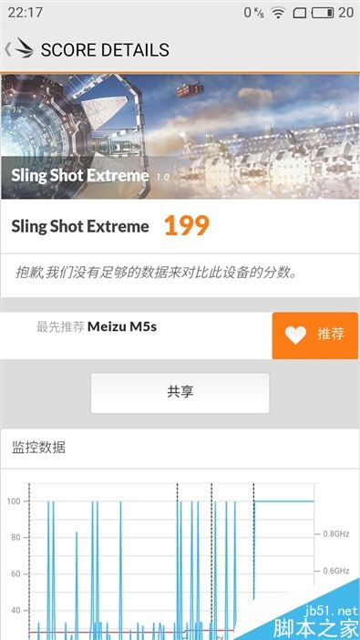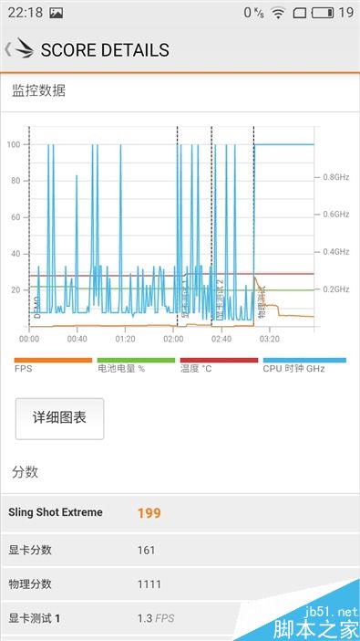 ↑↑↑3DMark GPU测试,魅蓝5s仅得到了199分,通过右图的监控数据看出,手机帧率大部分时间都维持在30FPS,掉帧现象比较明显。