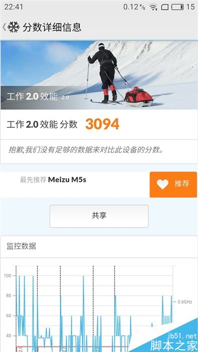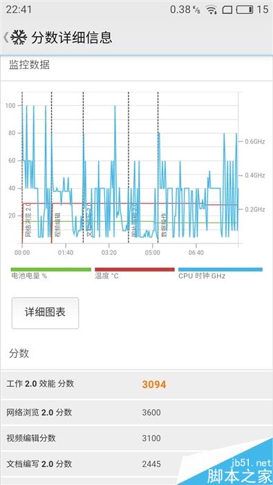 ↑↑↑魅蓝5s在PCMark综合效能测试中得分达到了3094分,不过通过右图的监控数据可以看出,CPU的时钟频率在0.6GHz上下浮动,远没有达到满频1.3GHz的运行状态。