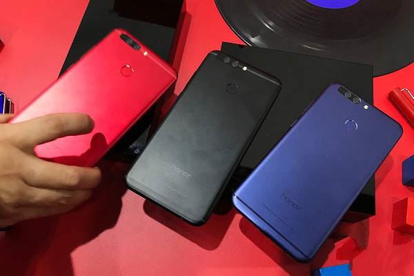 配色方面,荣耀V9比荣耀V8“好色”不少,一共有铂光金、幻夜黑、魅焰红以及极光蓝四种配色,不过现场只展示了其中三种配色。